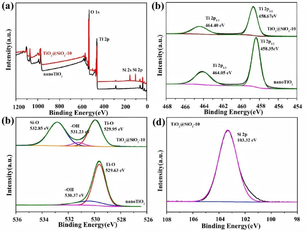 XPS was employed to investigate the surface composition and electronic environment of the nanoparticles. The full survey spectra are presented in Figure 4(a), where TiO2@SiO2-10 exhibits two prominent peaks at 152.06 eV and 103.53 eV, corresponding to Si 2s and Si 2p orbitals, respectively, providing direct evidence of silicon incorporation. As shown in Figure 4(b), the Ti 2p₃/₂ and Ti 2p₁/₂ peaks of pristine TiO2 appear at 458.35 eV and 464.05 eV. Upon SiOM2 coating, these peaks in TiO2@SiO2-10 shift to higher binding energies of 458.67 eV and 464.40 eV, respectively [28,29]. This positive shift is particularly significant as it demonstrates strong electronic interaction between the coating and core materials. The O 1s spectrum of bare TiO2 displays two peaks at 529.63 eV and 530.37 eV, assigned to Ti–O bonds and surface hydroxyl groups. After SiOM2 deposition, the O 1s spectrum of TiO2@SiO2-10 reveals three distinct peaks at 529.95 eV, 531.23 eV, and 532.85 eV, corresponding to Ti–O–Ti, Ti–O–Si, and Si–O–Si bonds, respectively [30,31]. Critically, the emergence of the Ti–O–Si peak at 531.23 eV serves as definitive evidence of chemical bonding at the core-shell interface rather than simple physical deposition. The systematic shift toward higher binding energies is attributed to silicon's higher electronegativity, which withdraws electron density from titanium atoms, thereby reducing the shielding effect [14]. Additional XPS spectra of other samples are provided in Figures S2–S4. These findings conclusively demonstrate successful SiOM2 coating with strong interfacial Ti–O–Si bonding on TiO2 nanoparticle surfaces.