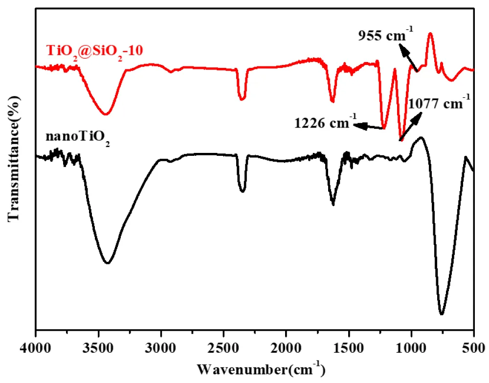 FT-IR spectroscopy was employed to identify chemical functional groups and verify interfacial bonding in the TiO2@SiO2 composites. The FTIR spectra of nano-TiO2 and TiO2@SiO2-10 are presented in Figure 5. Broad absorption bands at 3438 cm⁻¹ and 1619 cm⁻¹ correspond to stretching and bending vibrations of hydroxyl groups (–OH) from adsorbed water [14]. Critically, the SiOM2-coated spectrum exhibits distinct new bands at 1226 cm⁻¹, 1077 cm⁻¹, and 955 cm⁻¹, assigned to asymmetric stretching of Si–O–Si linkages and Ti–O–Si bonds [31,32]. The appearance of these Si-related peaks provides direct spectroscopic evidence of successful silica coating. Vibrations in the 600–900 cm⁻¹ region, present in both samples, are attributed to Ti–O bond stretching [8]. Significantly, after SiOM2 coating, the absorption band near 781 cm⁻¹ shows a substantial decrease in intensity accompanied by a pronounced red shift of approximately 27 cm⁻¹ compared to uncoated nano-TiO2. This dual change—reduced intensity and frequency shift—is particularly diagnostic, as it results from lattice distortion and Ti–O–Si bond formation at the core-shell interface [13]. The magnitude of this shift (27 cm⁻¹) unambiguously confirms chemical bonding between the SiOM2 shell and TiO2 core through partial substitution of Si for Ti, rather than mere physical adsorption. These complementary spectroscopic features collectively provide robust evidence for strong interfacial coupling in the TiO2@SiO2 structure.