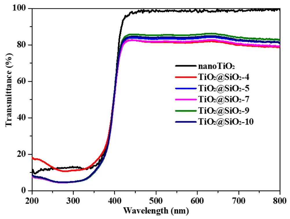 The UV–vis transmittance spectra of TiO2@SiO2 samples synthesized at varying pH values were recorded to assess their ultraviolet shielding capabilities, with the results depicted in Figure 6. All samples demonstrated excellent transparency within the visible light range (400–800 nm), which can be attributed to the small size of TiO2 nanoparticles (15–20 nm), less than half the wavelength of visible light, thereby allowing efficient passage of visible radiation. TiO2 nanoparticles are commonly employed in sunscreen formulations, where maintaining visible-light transparency is essential for cosmetic acceptability. Conversely, a pronounced decrease in transmittance was observed in the UV region (200–400 nm) for the SiOM2-coated samples, corresponding to the strong absorption band of TiO2 nanoparticles [31,32]. Notably, samples prepared under neutral to alkaline conditions exhibited UV transmittance values below 5%, indicative of substantial UV blocking ability [33,34]. This enhanced UV attenuation is likely due to the formation of a dense SiOM2 shell at these pH levels, which improves the ultraviolet light scattering efficiency of the TiO2@SiO2 composites.