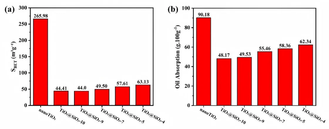 The crystal structures of the samples were examined using X-ray diffraction (XRD, EMPYREAN, Panalytical) with Cu Kα radiation as the X-ray source. Morphological features and elemental compositions were investigated by transmission electron microscopy (TEM) coupled with energy dispersive spectroscopy (EDS) (Talos F200S, Thermo Fisher). Specific surface areas were determined via nitrogen adsorption–desorption isotherms measured on a 3S-2000PSI analyzer (BeiShiDe), with the Brunauer–Emmett–Teller (BET) method employed to calculate the SBET values. Chemical states and elemental compositions were further characterized by X-ray photoelectron spectroscopy (XPS, ESCALAB 250Xi, Thermo Fisher) using an Al Kα radiation source. Ultraviolet–visible (UV-vis) diffuse reflectance spectra were recorded with a UV-2700i spectrophotometer (SHIMADZU), employing BaSO₄ as the reflectance standard. Whiteness values were quantified based on the CIE-Lab* 1976 color space using a Datacolor 800V spectrophotometer. Oil absorption measurements were conducted following a spatula rub-out method analogous to ASTM Standard D281-95.