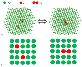 (a) Illustration of 2Ir ⇔ Ir2 equilibrated dimerization inside the 309-atom core of Pd surface-segregated 561-atom cuboctahedral nanoparticle. (b) 2D schematics of two representative configurations (“microstates”), corresponding to distributions of Ir atoms on atomic sites (left) and of Ir2 dimers as nearest-neighbor bonds.
