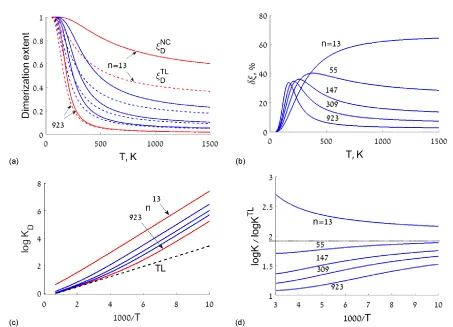 The temperature dependence of the dimerization extent (a), its relative increase, δξ (b), the equilibrium “constants” (c), and the NC/TL ratios (d), computed for two Ir solute atoms in cores of cuboctahedral Pd- Ir NPs containing 13, 55, 147, 309 and 923 atoms (size magic-numbers). The macroscopic TL values are given for comparison (dashed lines in (a) and (c)).