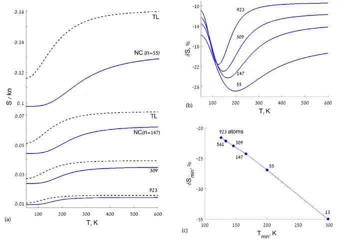 The dependence on temperature computed for different size NPs: (a) the configurational entropy per site (the numbers of core sites are indicated); (b) the corresponding relative decrease in entropy δS; (c) the magnitude of the δS minimum.