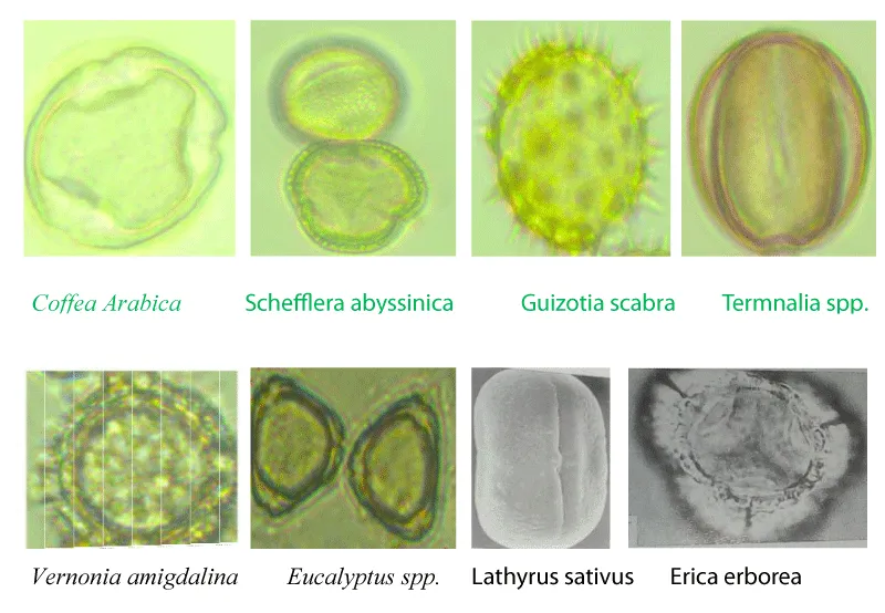 In this result, the botanical origin of the honey samples dominantly originated from nine different nectar source plant species (Guizotia scabra, Eucalyptus globulus, Eucalyptus camaldulensis, Sheffleria abyssinica, Vernonia spp, Erica arborea, Coffea arabica, Lathyrus sativus and Terminalia schimperiana (Table 1). These plant species are also known as major and minor honey plants for honey bees (A. mellifera). The relative pollen frequency of honey samples indicated that Schefflera abyssinica was a predominant honey plant in honey samples collected from the Bacho and Didu districts of I/A/bora and Gera and Gomma districts of Jimma Zones. Schefflera abyssinica is an abundant bee forage plant in moist highlands of southwestern and southeastern parts of Ethiopia and it provides monofloral honey in these areas [4]. It was also reported that Schefflera abyssinica is a major monofloral honey source tree in the Gera area (Degaga, 2017) which is similar to the current study results. Guizotia species was predominant in honey samples collected from the Ada Barga and Toke-Kuttaye districts of the west, and Waliso of Southwest Shoa Zones, while Eucalyptus globules were predominant in honey samples collected from the Amaya district of Southwest and Ejere and Chalia of West Shoa zones. Admasu, et al. (2018) reported that most of the Ethiopian highlands are covered with golden yellow flowers of Guizotia spp. with many different colors. On the other hand, the majority of honey samples from the Gera districts of the Jimma Zone were dominated by Coffea arabica which was identified as monofloral honey (Table 1) (Figure 2). Coffea arabica is a common cash crop in western Oromia and contributed much to monofloral honey samples. Admasu, et al. (2014) stated that Coffea arabica flowers provide abundant pollen and nectar in January for honeybees.